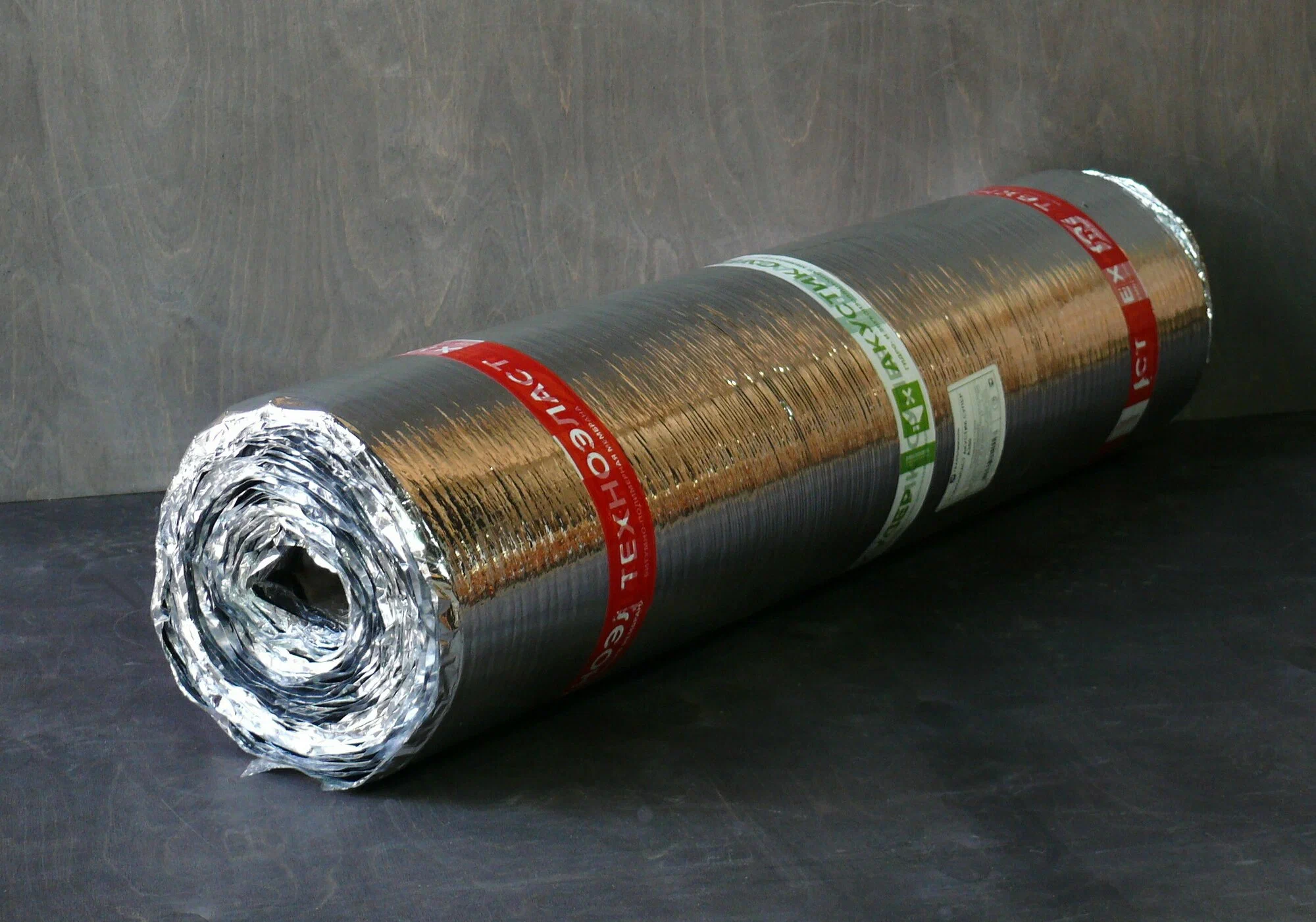 Техноэласт Акустик С Б350 – звукоизоляционный безосновный материал с самоклеящимся боковым нахлестом. Материал производится путем склейки битумным вяжущим металлизированной полиэфирной пленки со звукоизоляционным полотном. Самоклеящийся боковой нахлест дополнительно закрыт силиконизированной пленкой. Применяемая в материале металлизированная полиэфирная пленка обладает высокой стойкостью к проколу и предотвращает увлажнение звукоизолирующего слоя при укладке цементно- песчаной стяжки.
